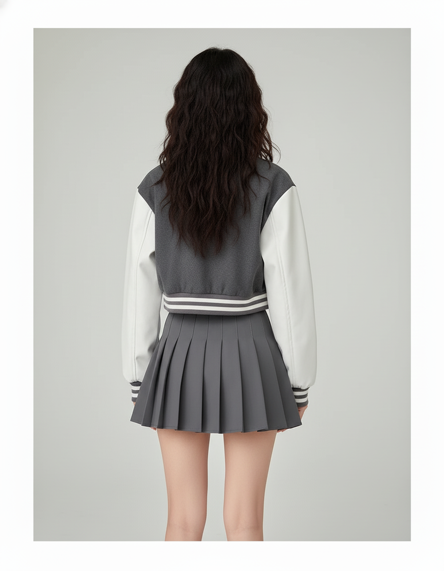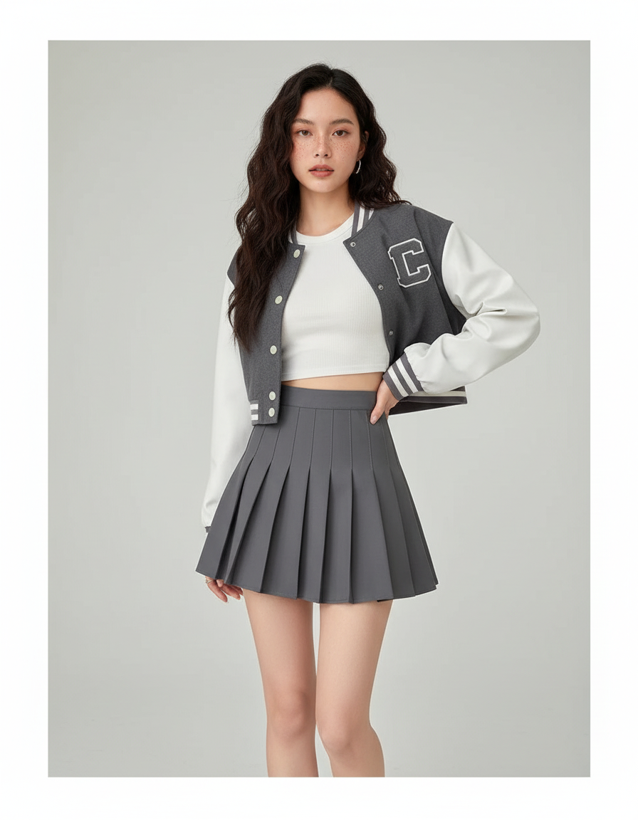 Notre jupe plissée grise, confectionnée en polyester de haute qualité, est la pièce maîtresse idéale pour affirmer votre style. Pour une allure "sortie" résolument contemporaine, associez-la à un crop top ajusté et un blouson varsity, comme illustré, pour un esprit streetwear chic. En journée, imaginez-la avec un pull en maille fine et des bottines pour un look urbain sophistiqué. Pour les soirées, osez un chemisier fluide en soie, des talons et des bijoux minimalistes : elle se métamorphose en un clin d'œil pour une élégance discrète mais impactante, parfaite pour un dîner ou un événement spécial.