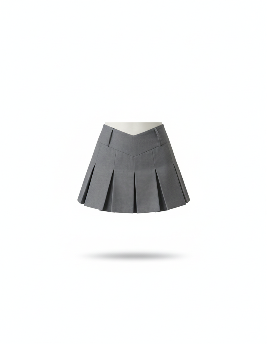Cette jupe plissée courte est de couleur grise et présente des plis réguliers sur l'ensemble de sa circonférence. Elle se porte au-dessus du genou.